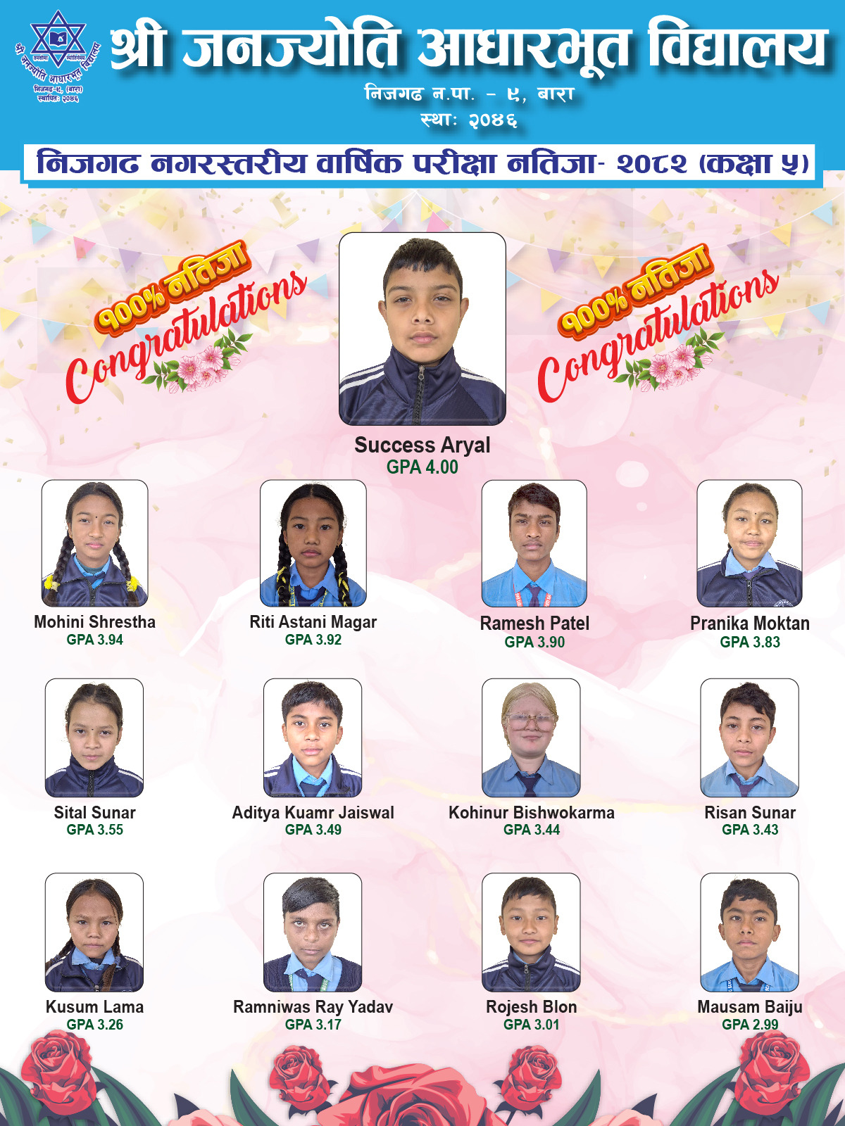 बारा : निजगढ नगरपालिका अन्तर्गत सञ्चालन भएको आधारभूत तह (कक्षा ५) को ५० औँ वार्षिक परीक्षामा निजगढ–९ स्थित श्री जनज्योति आधारभूत विद्यालय उत्कृष्ट बनेको छ । नगरभित्रका ३२ वटा विद्यालयलाई पछि पार्दै विद्यालयले शतप्रतिशत नतिजासहित प्रथम स्थान हासिल गरेको हो ।